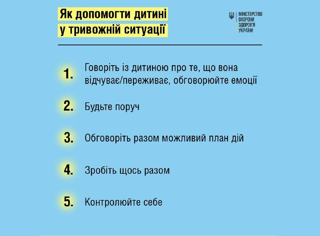Для того, щоби мінімізувати негативний вплив на психіку дітей, Міністерство охорони здоров’я України пропонує дотримуватися таких рекомендацій: