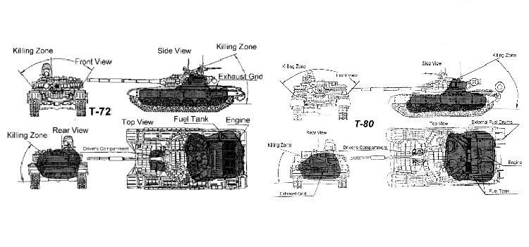 - Танк у місті — сліпий. Кути огляду оглядових приладів не дозволяють ані мехводу, ані командиру, ані навіднику бачити верхні поверхи будівель. Тому гранатомет згори, пляшка з коктейлем Молотова йому страшні. Бити по танку з верхньої півсфери потрібно в моторний відсік — він позаду за баштою, також дах башти. Пам’ятайте, як горіла російська танкова колона в Грозному.