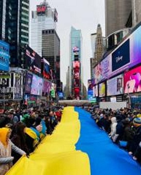 На Таймс-сквер – площа у центральній частині Манхеттена в Нью-Йорку розгорнули великий прапор України. Акції на підтримку України проходять по всьому світу. Світ засуджує агресію Росії.