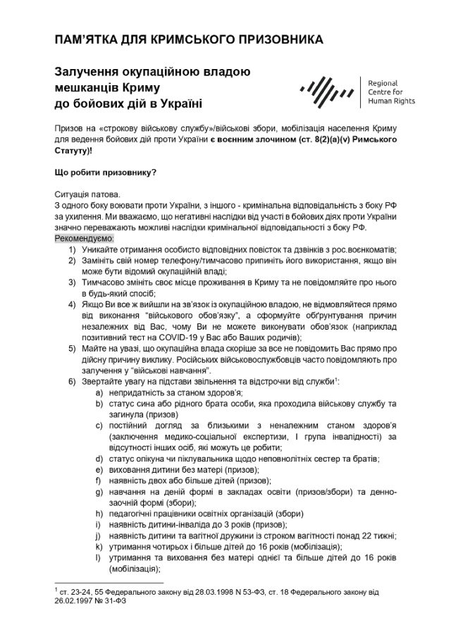 Регіональний центр прав людини розробив алгоритм дій для кримчан, яких призивають в російську армію та залучають до російсько-української війни.