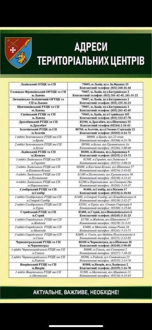 Адреси територіальних центрів комплектування та соціальної підтримки Львівщини можна знайти на фото нижче.