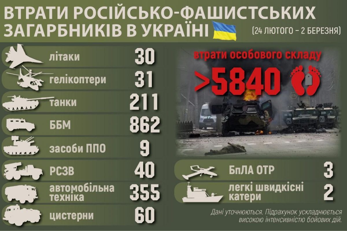 Загальні бойові втрати противника з 24.02 по 02.03 орієнтовно склали: