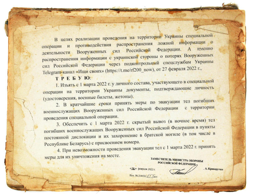 На третій день російського широкомасштабного вторгнення, а саме 26 лютого 2022 року заступник міністра оборони РФ з українським прізвищем Криворучко видає доволі цікаве розпорядження для військовослужбовців, які беруть участь у «спеціальній операції на території України». Це розпорядження має гриф «ДСП» (укр. – для службового користування), і номер 210/32/655 дсп від 26.02.2022 року. Його доведено до усіх підрозділів і з’єднань, які задіяні в «операції». Текст розпорядження опублікував на своїй сторінці колишній головнокомандувач ЗС України генерал Віктор Муженко.