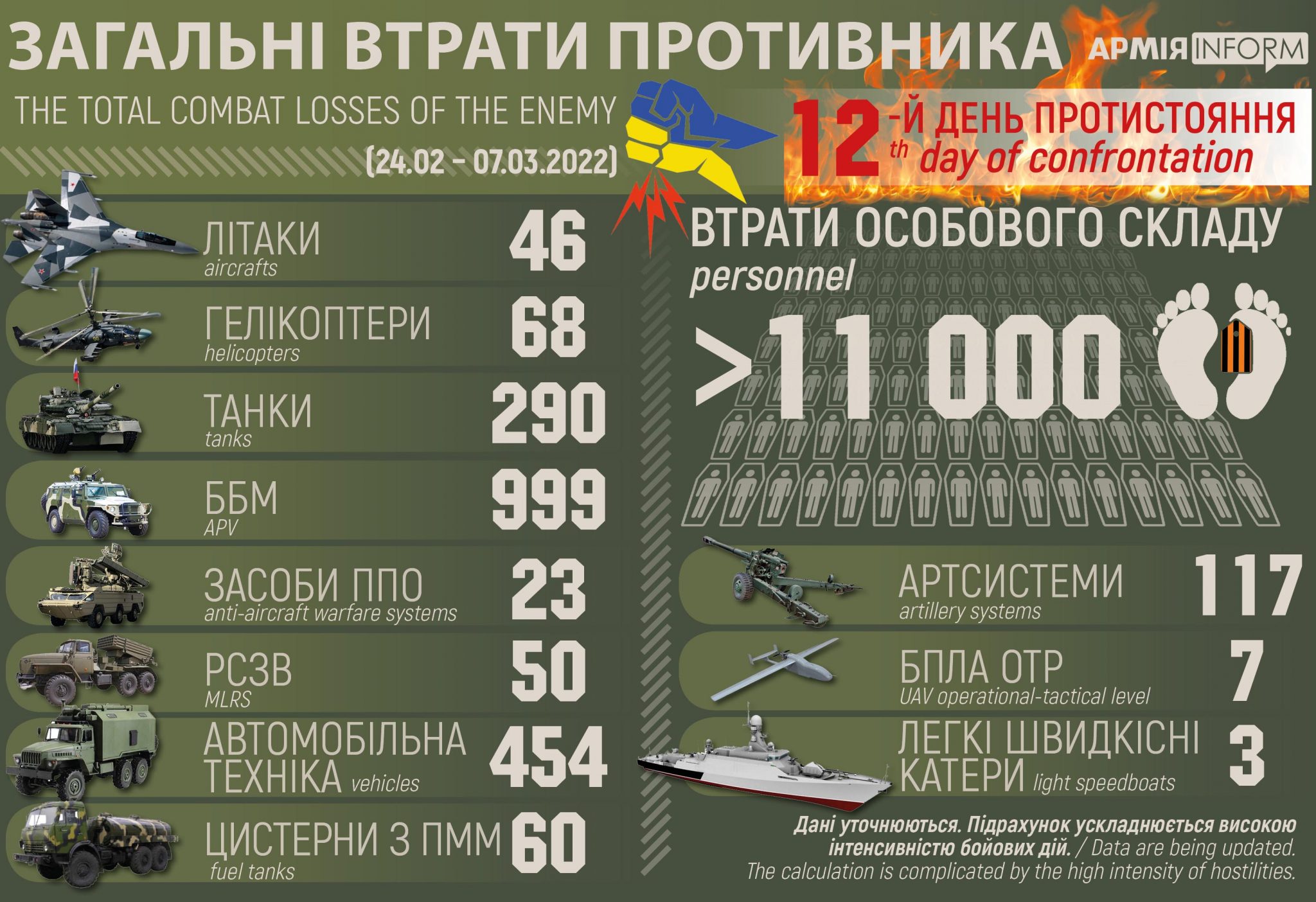 Загальні бойові втрати противника з 24.02 по 07.03 орієнтовно склали: