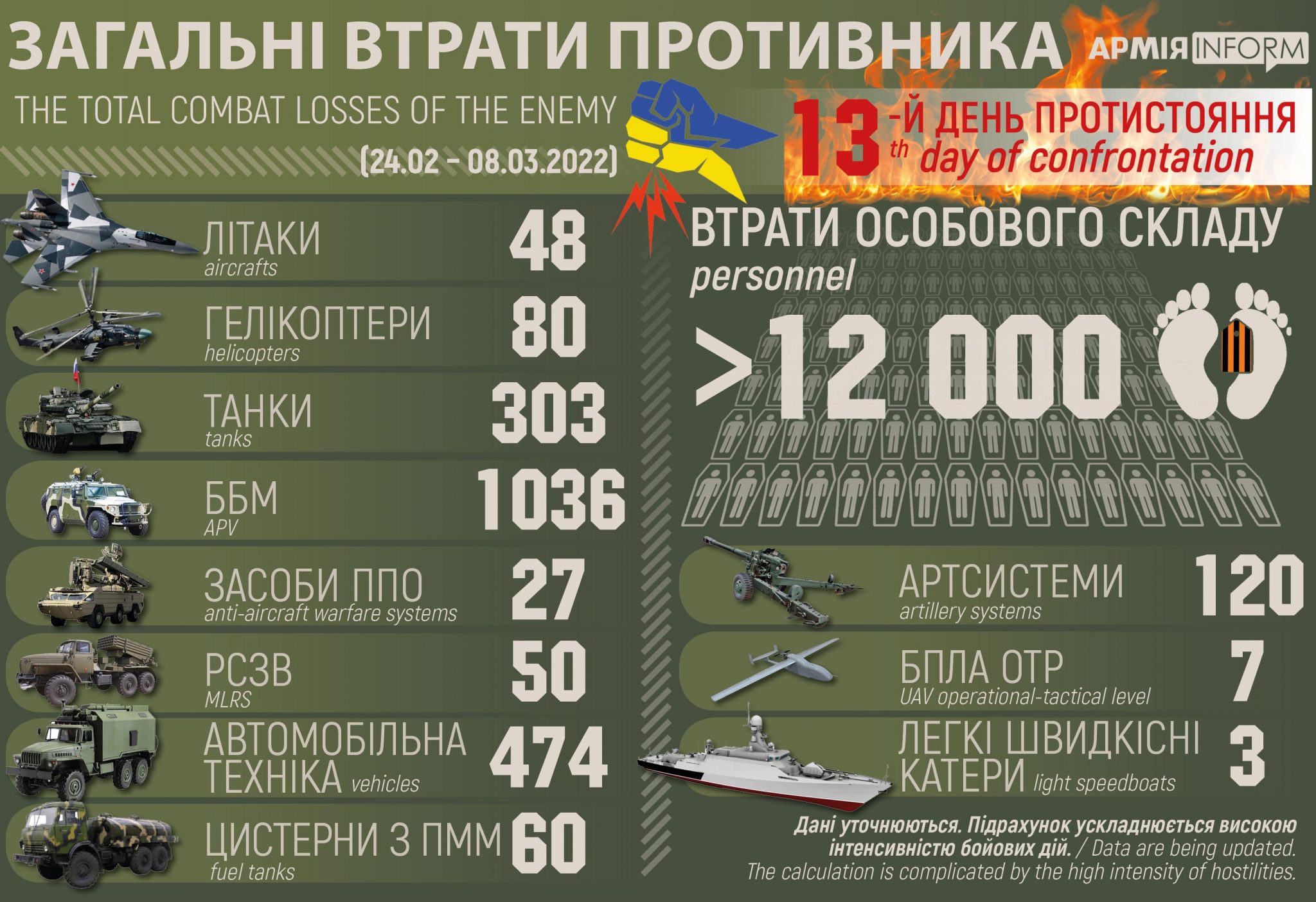Загальні бойові втрати противника з 24.02 по 07.03 (включно) орієнтовно склали: