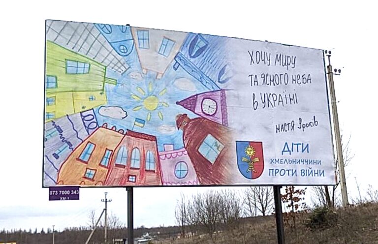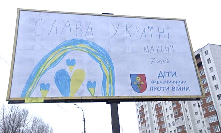 У Хмельницькому та на в’їзді до міста, замість білбордів зі вказанням напрямку руху російським окупантам, їхнім танкам і кораблям — дитячі малюнки з патріотичними закликами й підтримкою українських захисників.