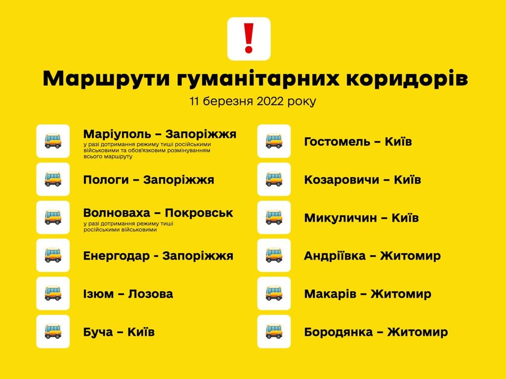 11 березня в Україні запрацюють 12 гуманітарних коридорів для евакуації з атакованих російськими військами населених пунктів у різних областях.
