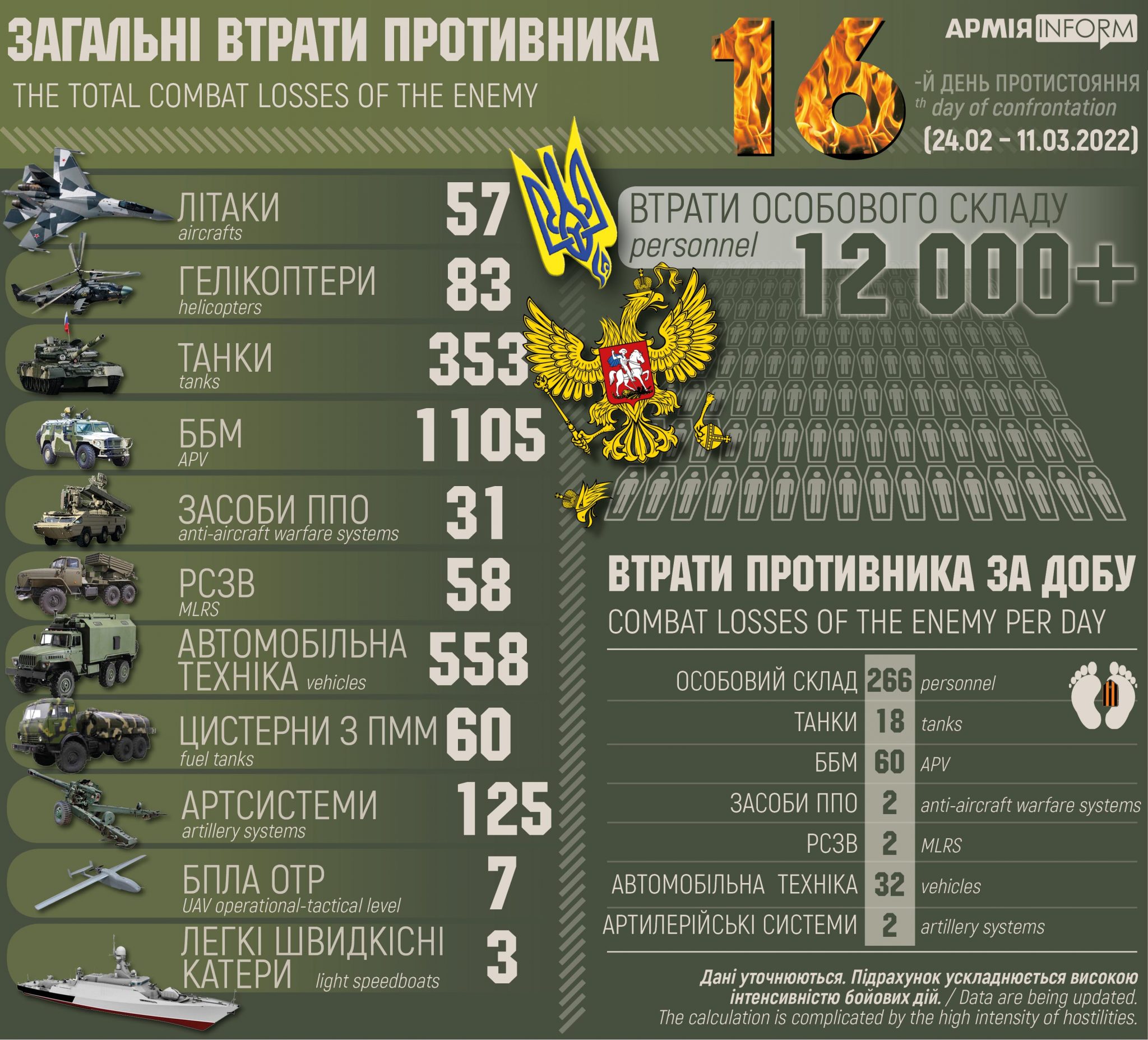 Загальні бойові втрати противника з 24.02 по 11.03 орієнтовно склали: