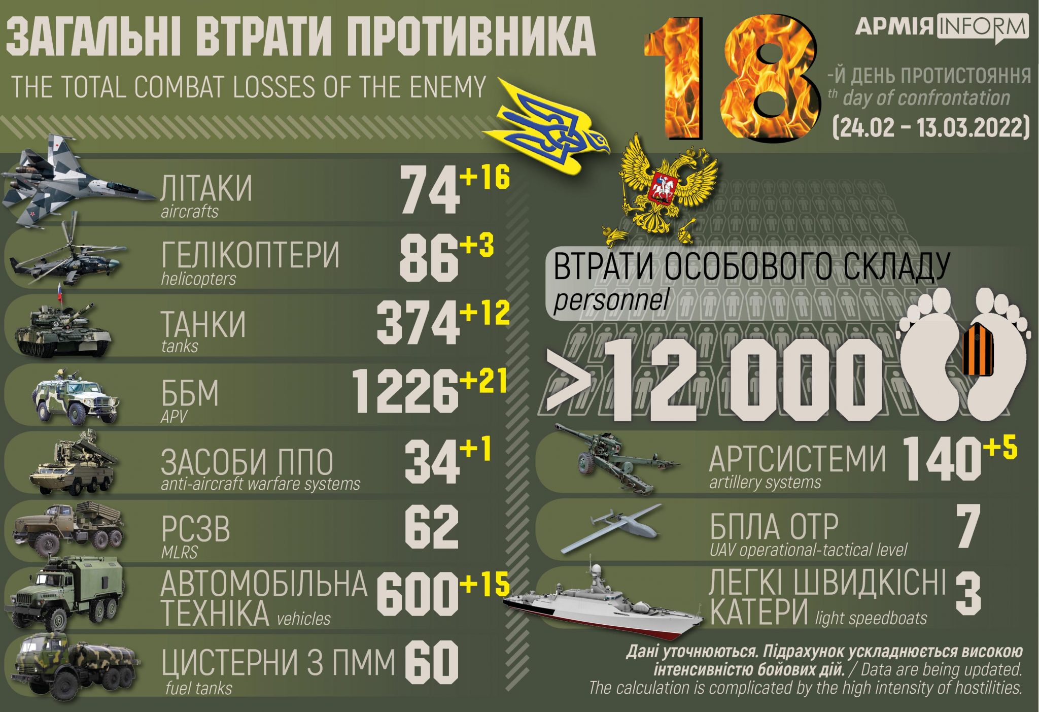 Загальні бойові втрати противника з 24.02 по 13.03 орієнтовно склали: