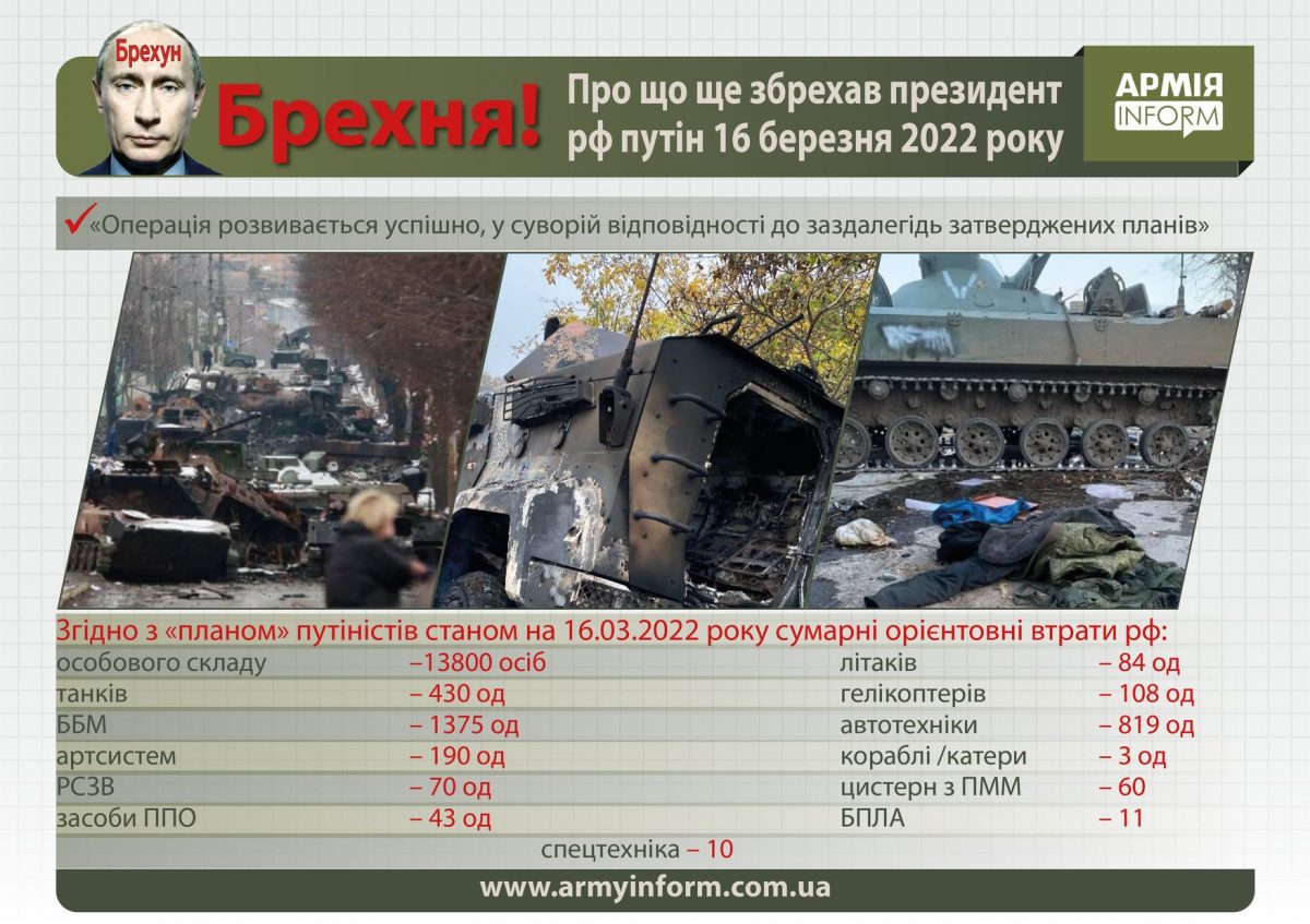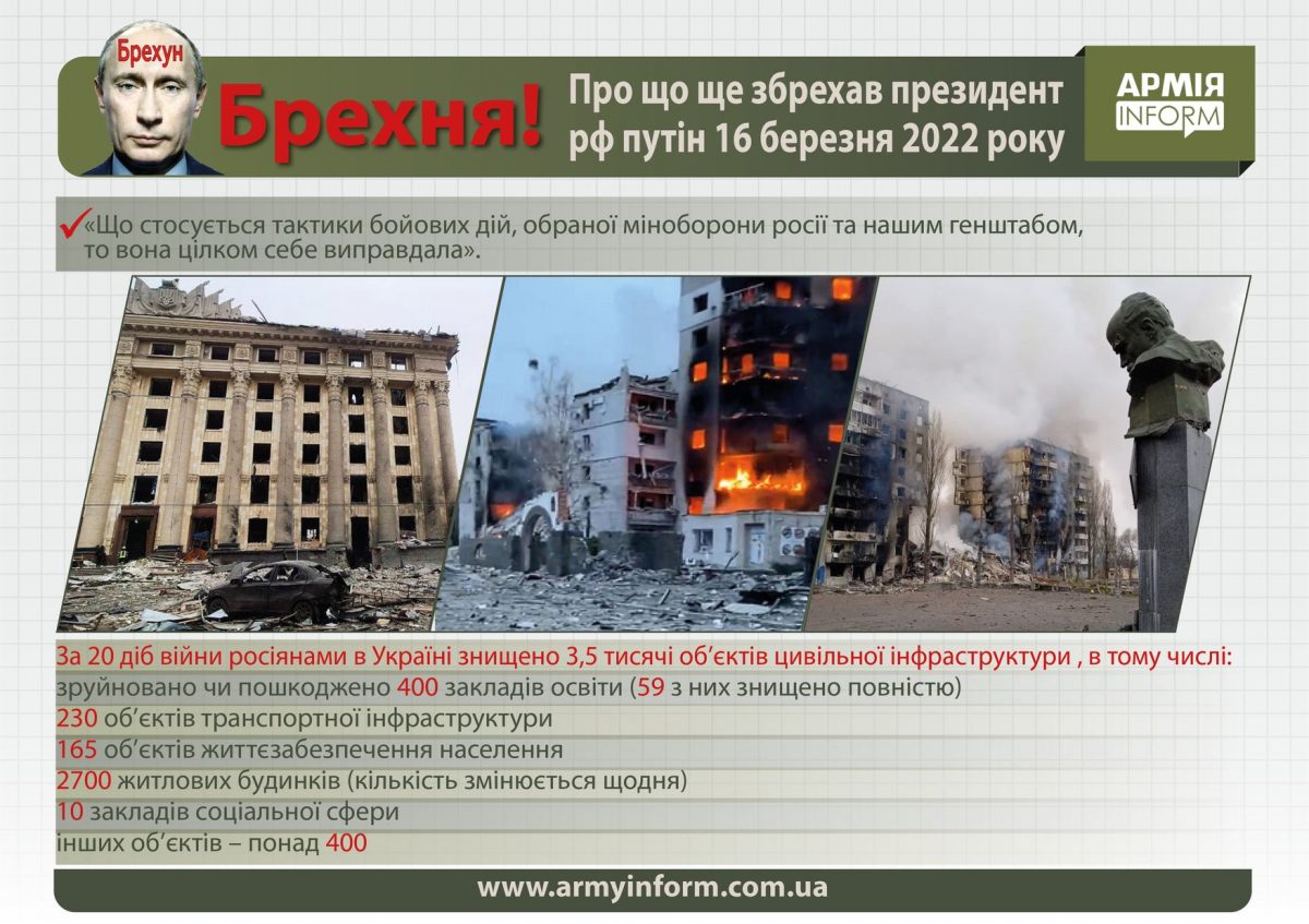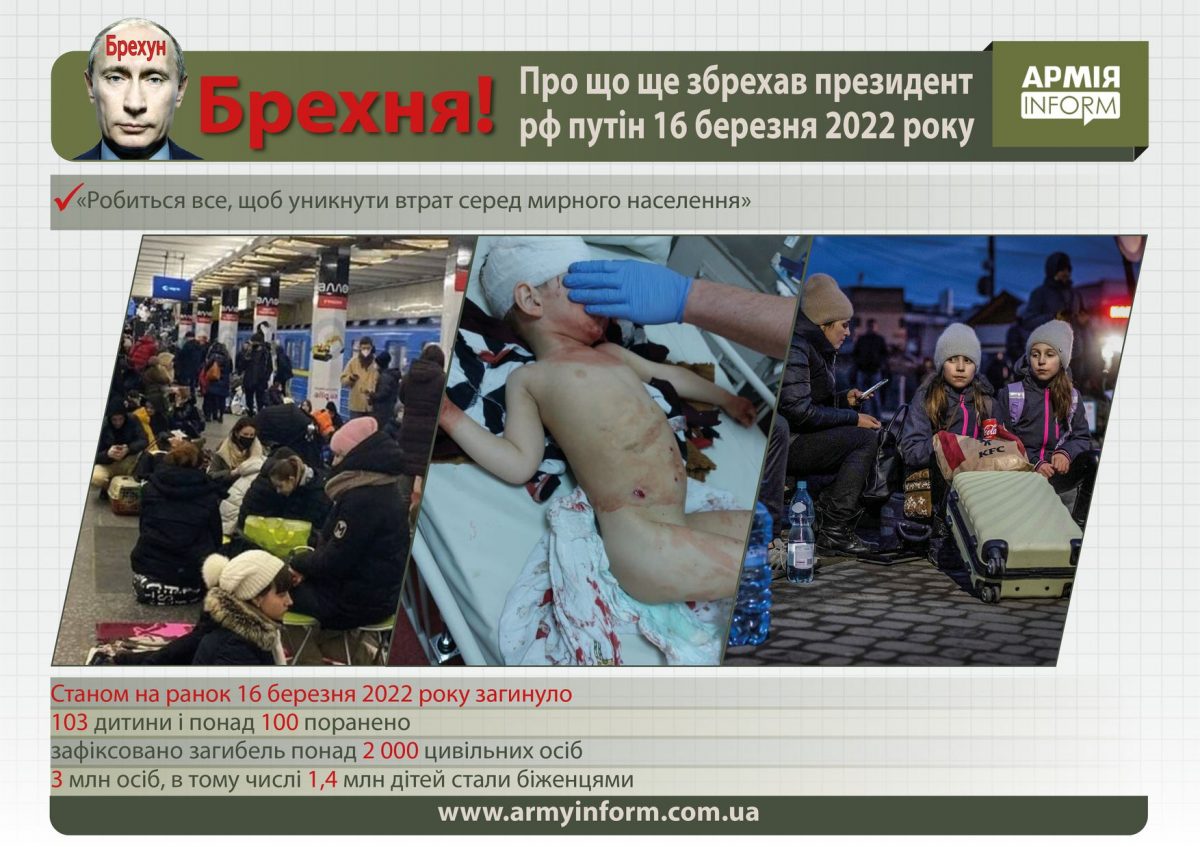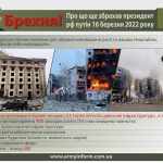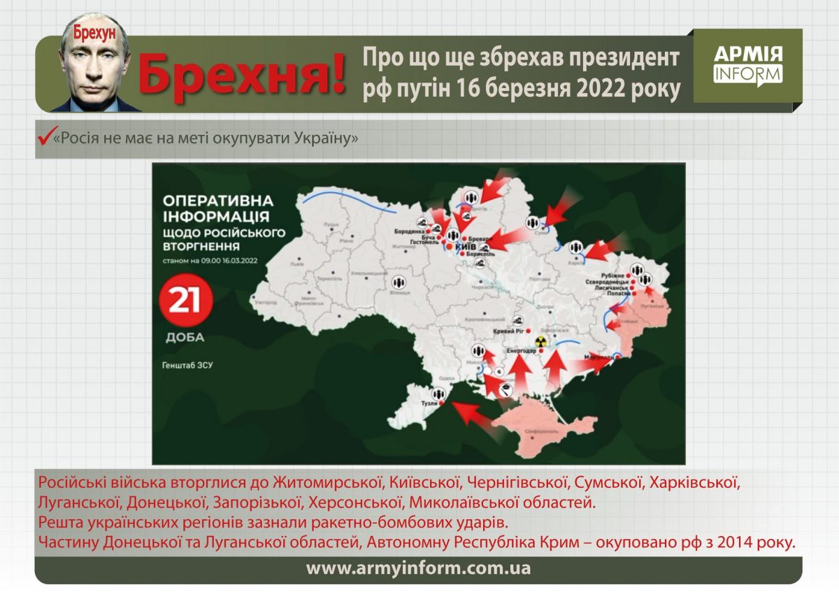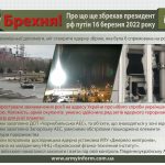 Державна машина країни-агресора не припиняє продукувати антиукраїнські фейки у цілодобовому режимі. Особливо врожайною на брехню стала середа 16 березня. Цього дня відзначився неофюрер россії в.путін. Під час «наради щодо заходів соціально-економічної підтримки регіонів» більшу частину своєї промови він присвятив війні проти України, змішавши до купи старі й нові фейки роспропаганди.