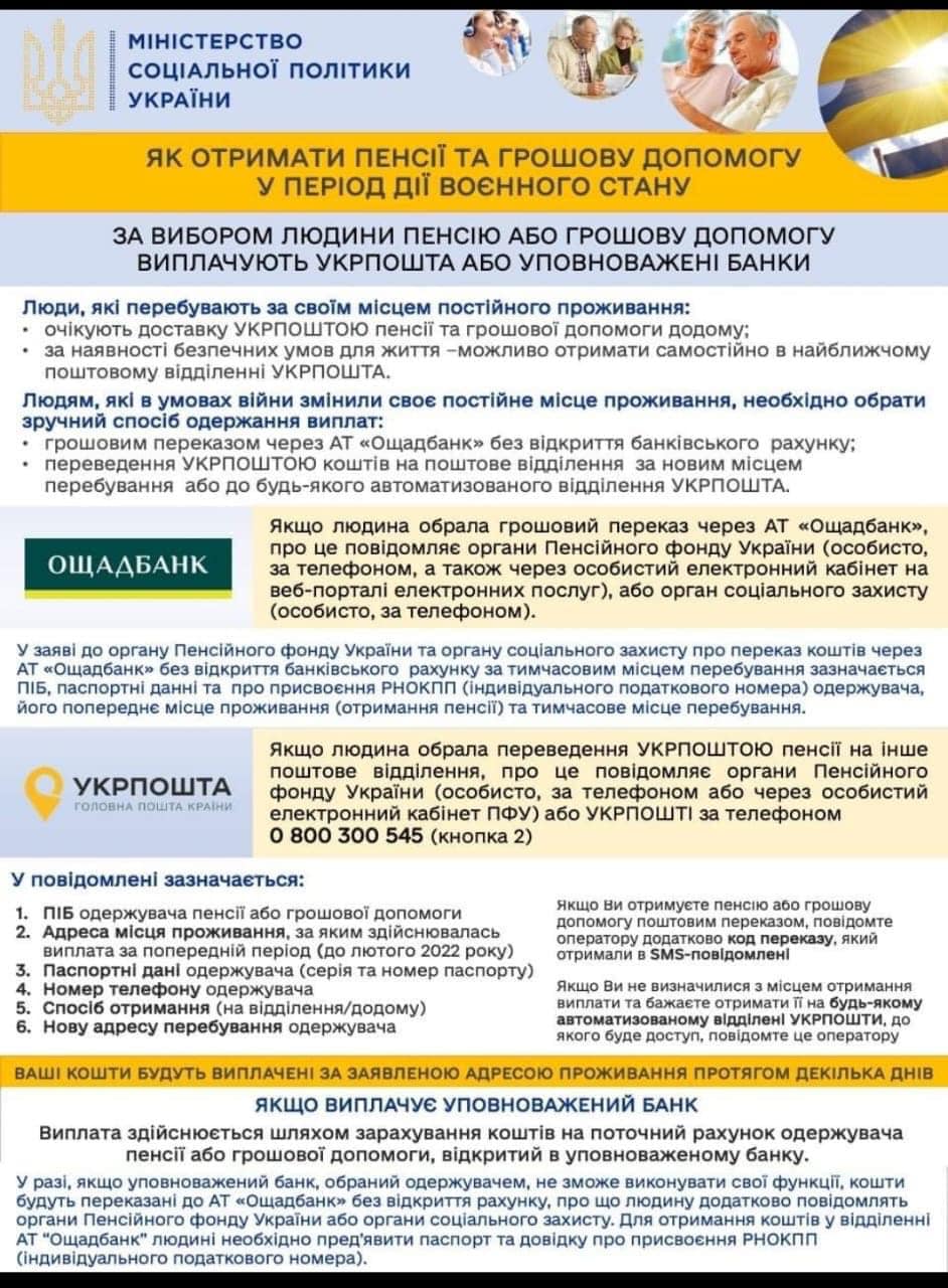 Як отримати пенсії та грошову допомогу у період дії воєнного стану, можна дізнатися з інфографіки на сторінці Фейсбук Верховної Ради України.