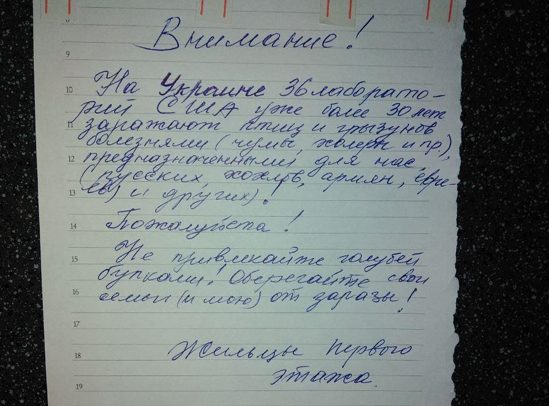 У ньому звертаються до мешканців під’їзду і всіх сусідів з проханням припинити підгодовувати голубів, адже американці заражають саме цих птахів надзвичайно небезпечними хворобами в українських біолабораторіях, щоб надалі ті вбивали росіян, євреїв та вірменів.