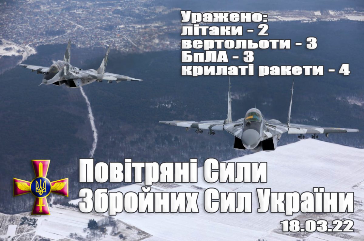 18 березня Повітряні Сили Збройних Сил України уразили 10 повітряних цілей, ще дві цілі – на рахунку протиповітряної оборони Сухотних військ.