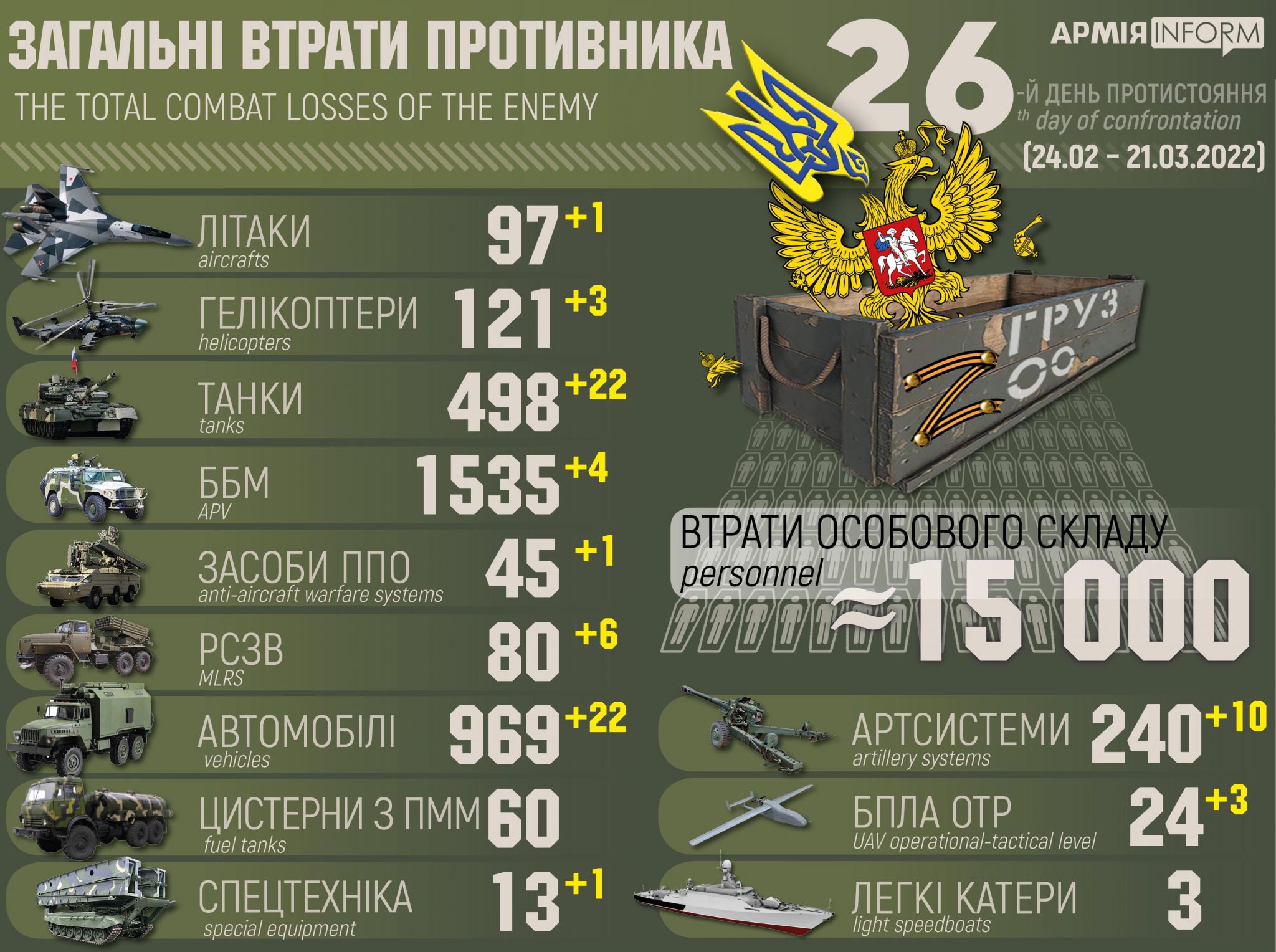 Загальні бойові втрати противника з 24.02 по 21.03 орієнтовно склали: