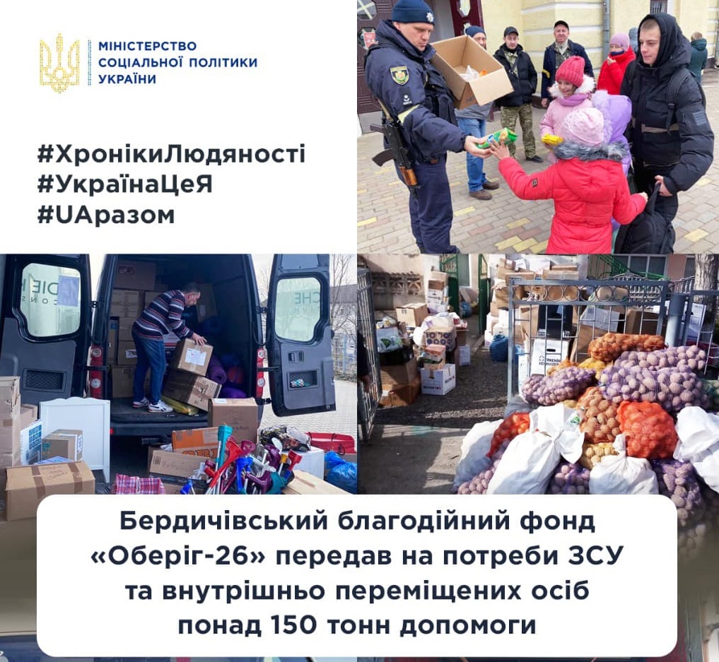 Марина Лазебна, Міністр соціальної політики України, повідомила, що від початку повномасштабної агресії Росії завдяки співпраці Мінсоцполітики та Бердичівського благодійного фонду «Оберіг-26» люди у найбільш постраждалих населених пунктах отримали гуманітарну допомогу загальним обсягом понад 150 тонн, інформує відомство.