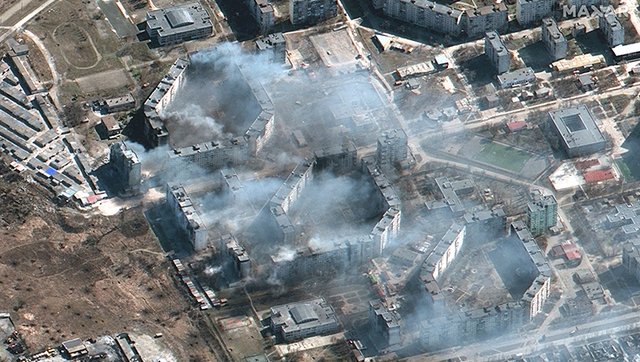 Додаткові знімки показують позиції російської військової артилерії на північний схід від Маріуполя та дим, що піднімається від палаючих житлових будинків.
