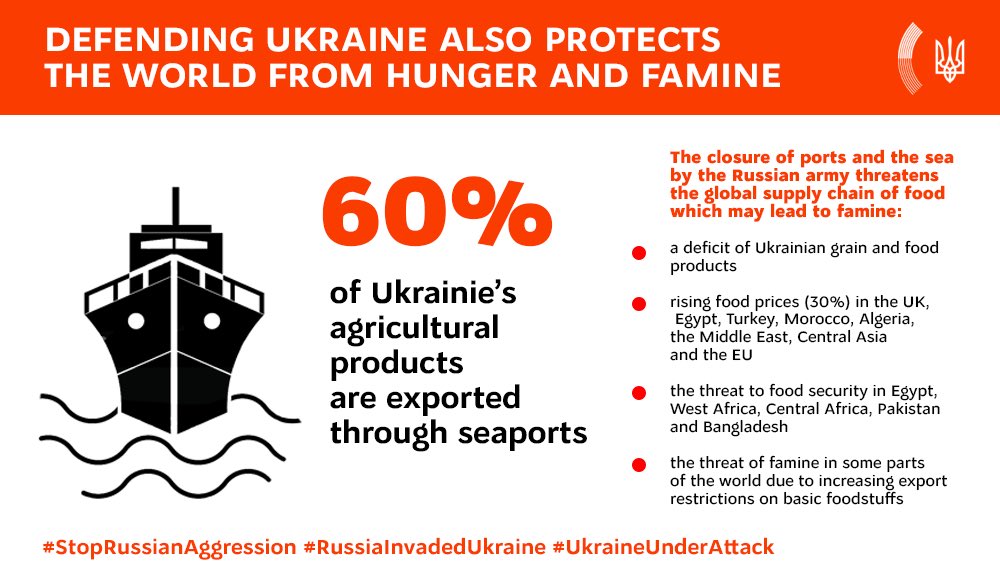 До нині наші сільськогосподарські виробники були грантами продуктової безпеки низки країн Близького Сходу, Північної та Центральної Африки, Південно-Східної Азії. Для окремих країн поставки нашого зерна є критично важливими. Так, Ліван отримував з України до 80% пшениці, Єгипет — 50% олії і 30 % пшениці, Лівія — 40% пшениці, Ємен — 27%, а Туреччина — 90%.