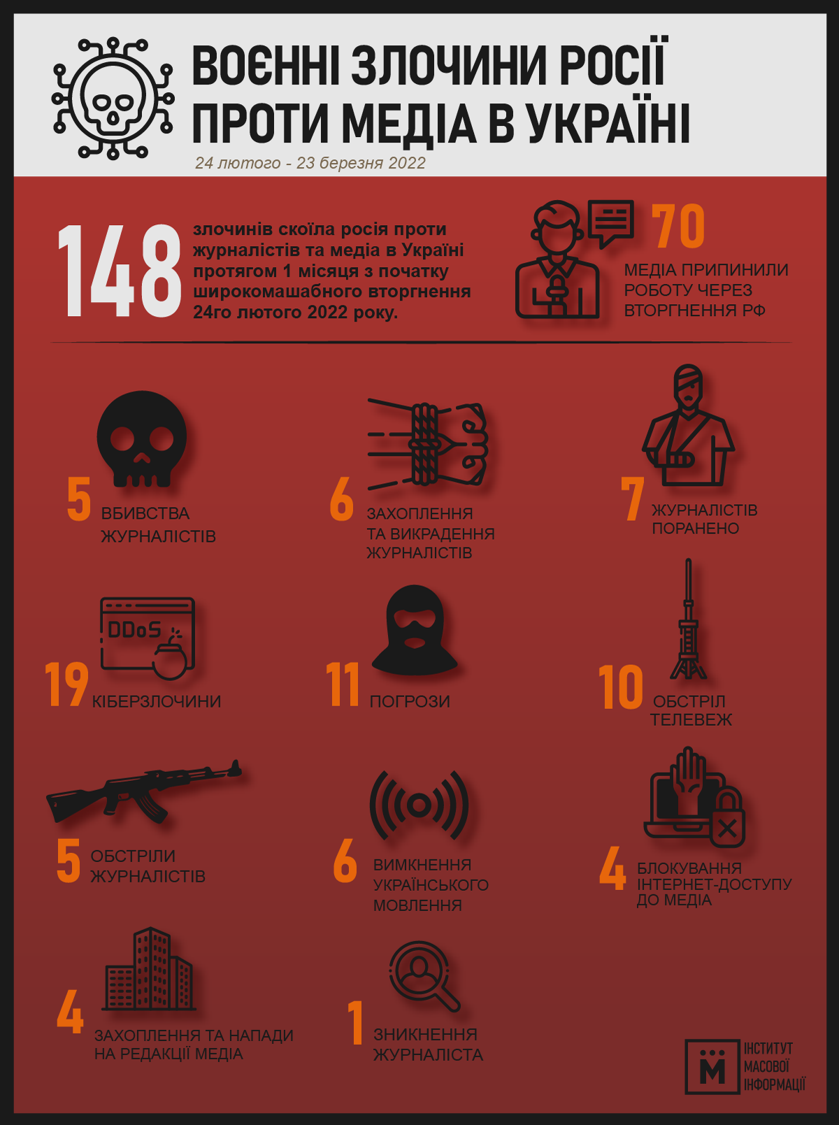 З 24 лютого до 24 березня 2022 року, з початку широкомасштабного вторгнення в Україну, росія скоїла 148 злочинів проти журналістів та медіа.