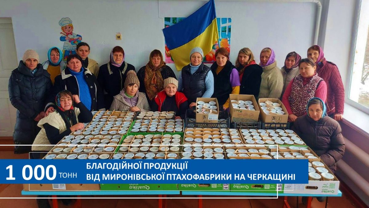 Понад 1 000 т продукції передано на потреби громад та Збройних Сил України в різних куточках нашої держави з підприємств МХП, що розташовані на Черкащині. Курятину отримали не лише жителі сіл та міст, що організували у своїх громадах приготування м’ясної тушонки для військових і тероборони, а й лікарні, дитячі будинки, диспансери, церкви, центри прийому біженців, волонтерські та громадські організації тощо.