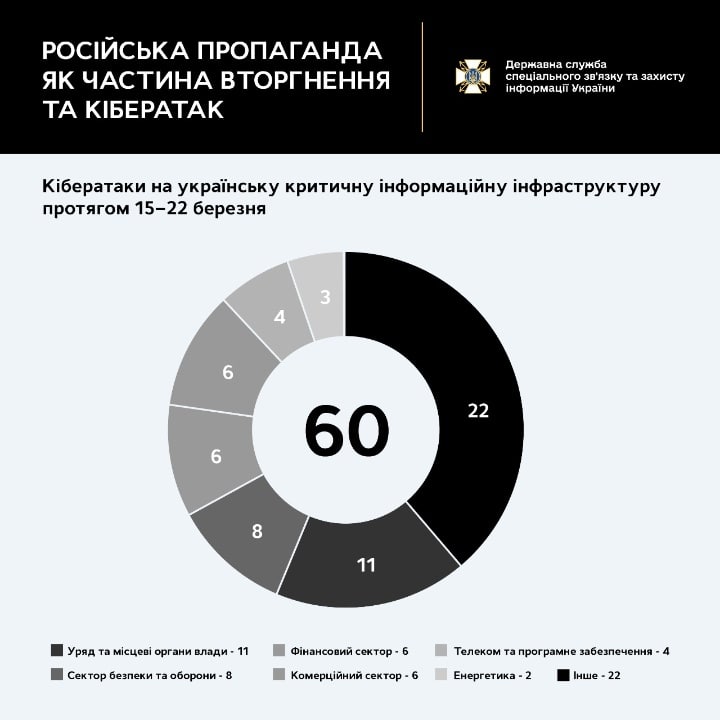 Загалом протягом 15–22 березня Урядова команда реагування на комп’ютерні надзвичайні події CERT-UA зафіксувала 60 кібератак.