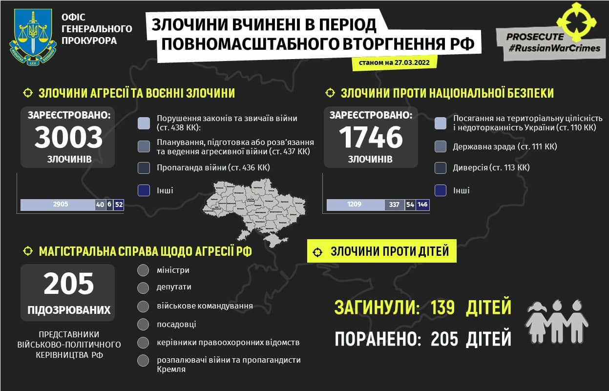 Офіс Генерального прокурора повідомляє, що станом на 27 березня вже задокументовано 3003 злочини окупантів, вчинені у період повномасштабного вторгнення рф. Крім того ворог здійснив 1746 злочинів проти національної безпеки.