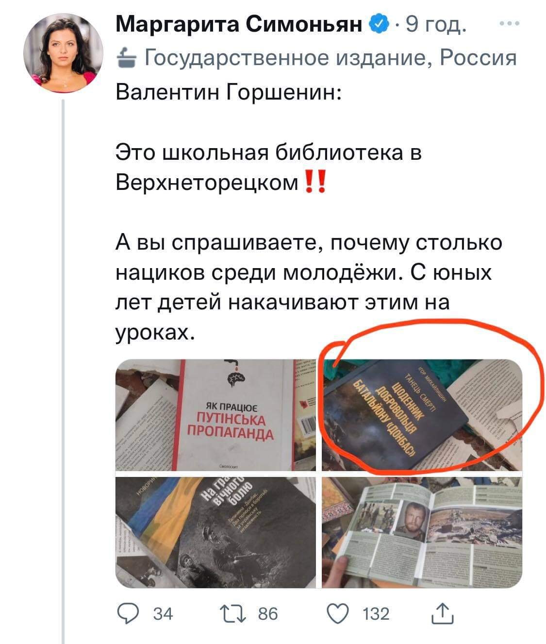 Вчора чи не найактивніша роспропагандистка маргарита симоньян перепостила публікацію когось зі своїх однодумців. У ній йшлося про українську молодь, яку «накачують» відповідною літературою, і тому вони стають «нациками». Як «доказ» — фото декількох книг з бібліотеки одного з українських сіл, яке нібито захопила росармія. Все б нічого, ще один брехливий московитський пост, але на фото, окрім інших — обкладинка книги Ігоря Михайлишина «Танець смерті. Щоденник добровольця батальйону „Донбас“». У 2019 році про цього автора й добровольця АрміяInform робила матеріал «Зафіксував усе в книзі. Щоб друзі, які загинули, жили на папері», тому Ігор для нас — людина не чужа.