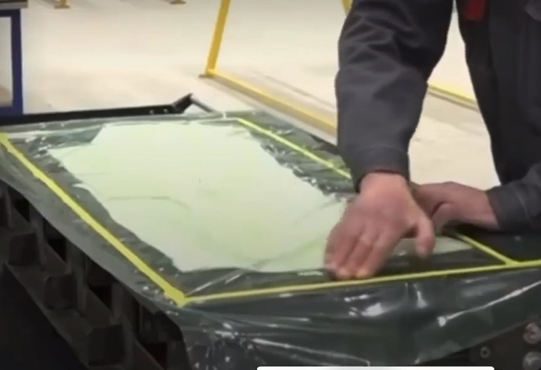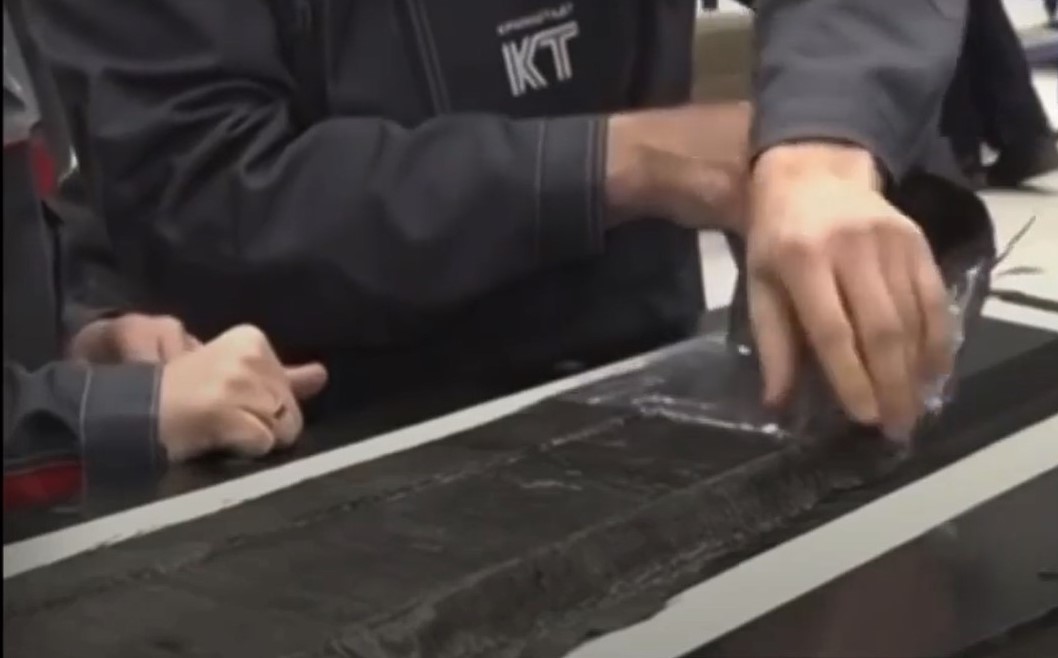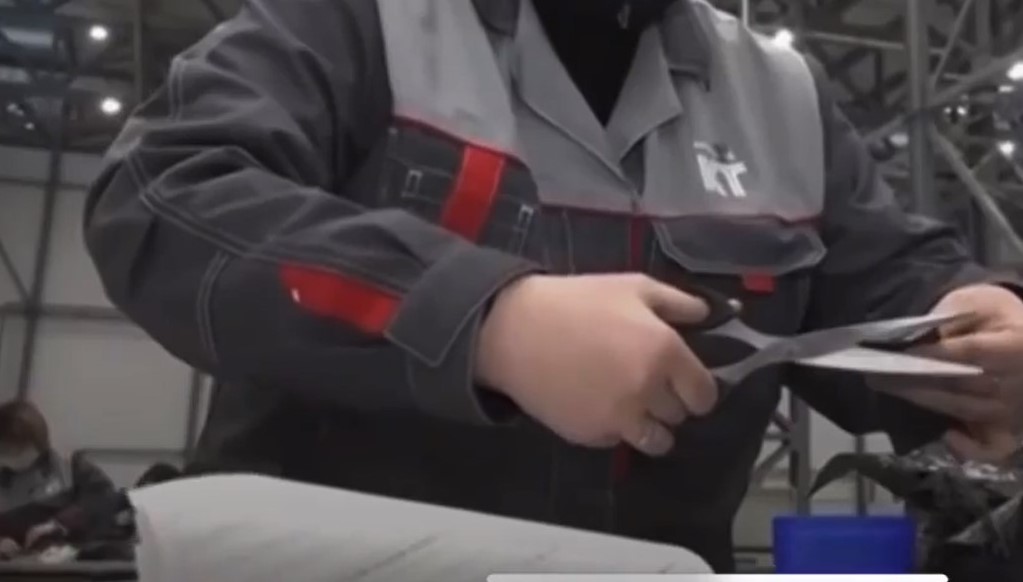 У наступній сцені сюжету черговий «робітник підприємства» розповідає про те, як вони ВРУЧНУ розкроюють вуглецеву тканину на заготовки для безпосередньої викладки її в матрицю для виготовлення деталей. Російського глядача нічого не збентежило, а ось нас — так… Новітнє виробництво, де на столах лежать дерев’яні трикутники, маркери, кравецькі ножиці та лінійки? Серйозно? Шойгу, а де ж тоді роботи, станки з числовим програмним управлінням?