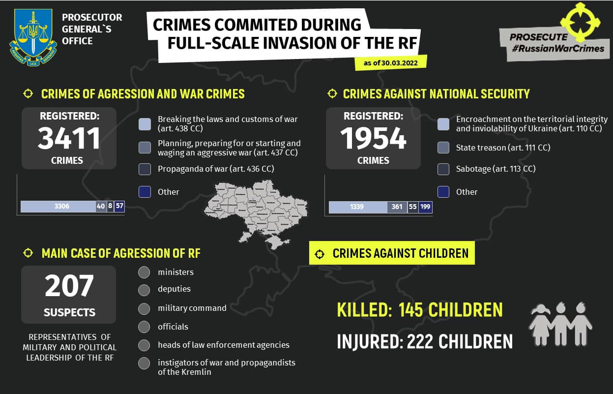 З першого дня війни Офіс Генерального прокурора документує злочини окупантів. Станом на 30 березня зареєстровано 3411 злочинів окупантів, вчинені у період широкомасштабного вторгнення рф. Ворог здійснив 1954 злочини проти національної безпеки.