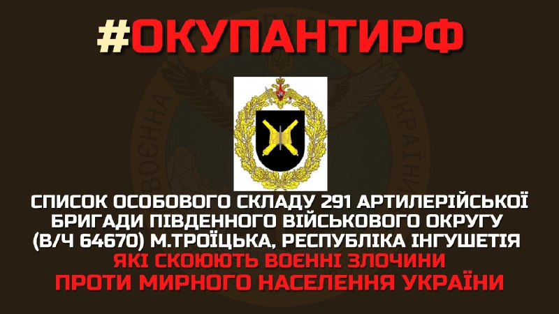 ГУР МО України здобуло список військовослужбовців 291-ї артилерійської бригади 58-ї загальновійськової армії Південного військового округу (в/ч 64670) Республіка Інгушетія, Сунженський р-н, н.п. Троїцька, що скоюють воєнні злочини проти народу України. Про це інформує пресслужба ГУР МОУ.