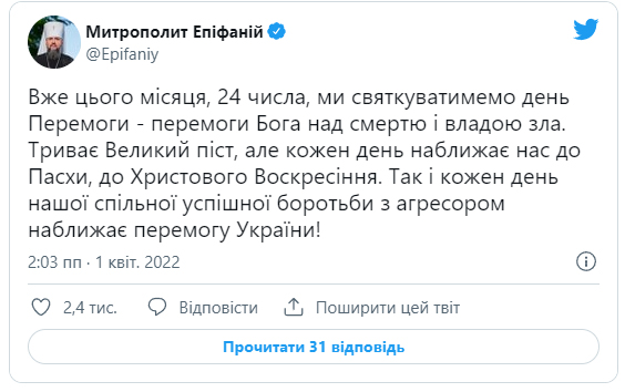 «Вже цього місяця, 24 числа, ми святкуватимемо день Перемоги – перемоги Бога над смертю і владою зла. Триває Великий піст, але кожен день наближає нас до Пасхи, до Христового Воскресіння. Так і кожен день нашої спільної успішної боротьби з агресором наближає перемогу України», – заявив митрополит Епіфаній.