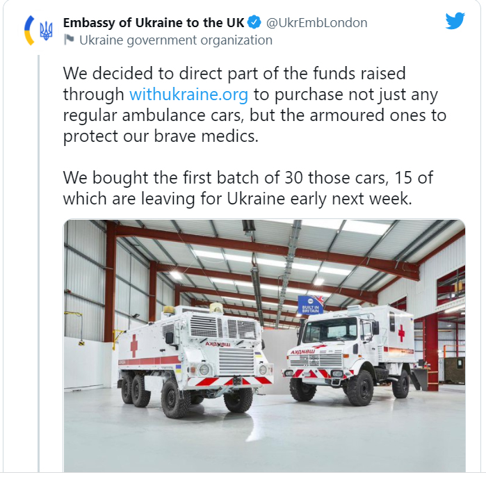 До України відправлять 30 броньованих «швидких», куплених посольством на зібрані кошти. Про це у Twitter повідомило посольство України у Великій Британії.