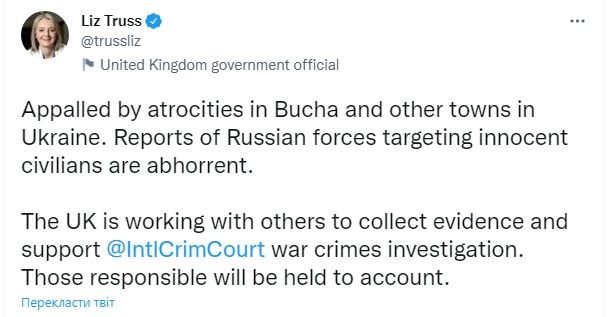 – Велика Британія співпрацює з іншими для збору доказів і підтримки розслідування військових злочинів Міжнародним кримінальним судом. Винні будуть притягнуті до відповідальності, – додала Трасс.