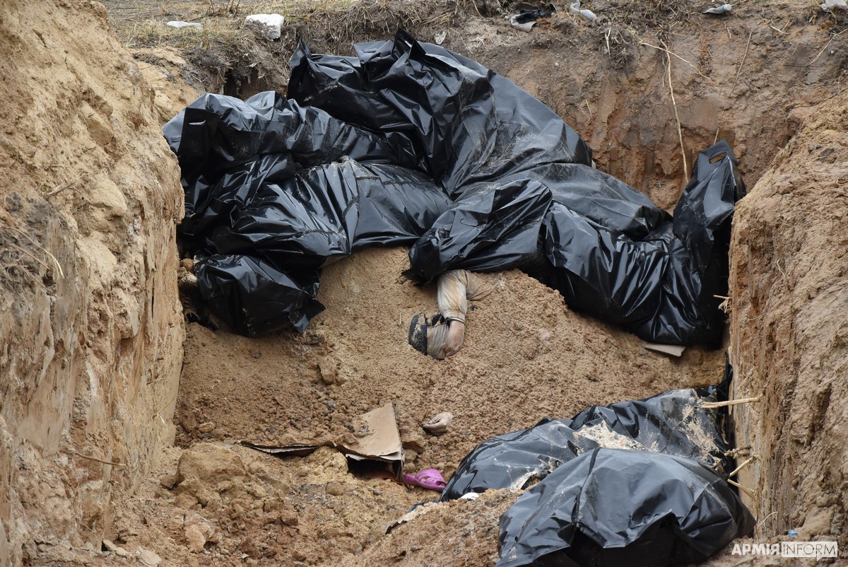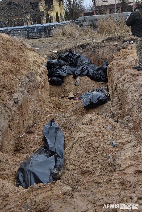 Сотні винищених російськими військовими місцевих мирних мешканців міста. Серед жертв воєнних злочинів російських військ зґвалтовані жінки, тіла яких намагалися спалити, діти, літні люди, багато чоловіків. У багатьох – зв’язані руки, є сліди катувань, багато людей убиті пострілами у потилицю. Зруйновані та спалені помешкання сотень бучанців.