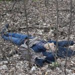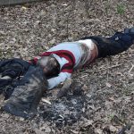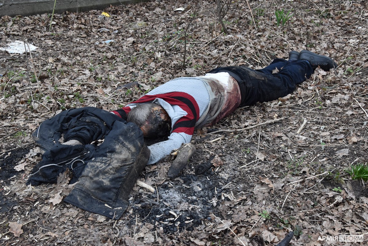 Але це неостаточна цифра. Коли ми знімали знищений вщент торговельний центр поруч з обгорілими житловими будинками, до нас під’їхали на велосипедах двоє місцевих мешканців і повідомили, що можуть показати тіла ще двох вбитих місцевих мешканців. За перші кілька днів з моменту визволення Бучі тіла вбитих місцевих мешканців забрали з вулиць міста. За розповідями очевидців, багато тіл бучанців лежали посеред вулиць міста, поблизу своїх будинків. Ми вирушили до місця ще одного злочину, скоєного російськими військовими. Їхали кілька хвилин. Переїхали залізницю. Зупинилися. За 2-3 десятки метрів від дороги у лісопосадці лежало два тіла чоловіків зі зв’язаними ногами та кульовими отворами у голові. Голова одного з них обгорівша…