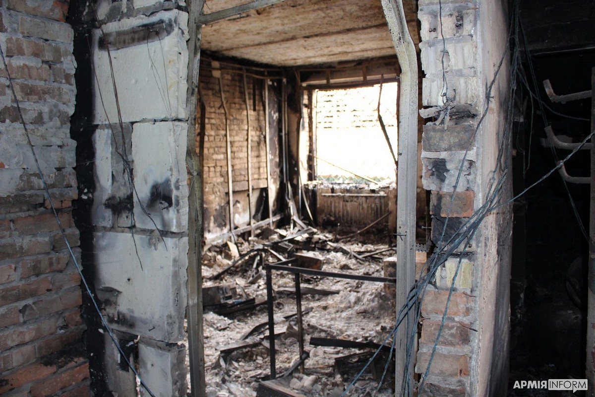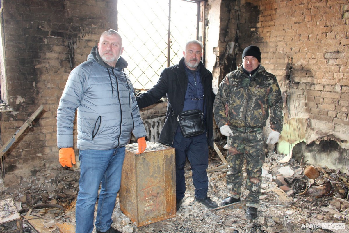 Біля вигорілої вщент будівлі Бородянського районного суду ми бачимо кількох чоловіків. Підходимо. Знайомимось. Чоловік, який представляється Геннадієм Вікторовичем, виявляється головою Бородянського районного суду.