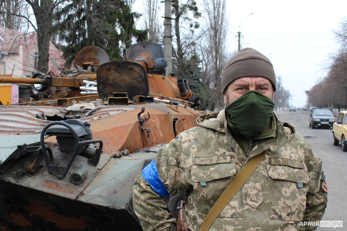 Біля наступної будівлі бачимо військових із синьою стрічкою на рукаві. Військовослужбовець із позивним «Краб», який входить до роти охорони територіального центру комплектування, розповідає про те, як тримали оборону: