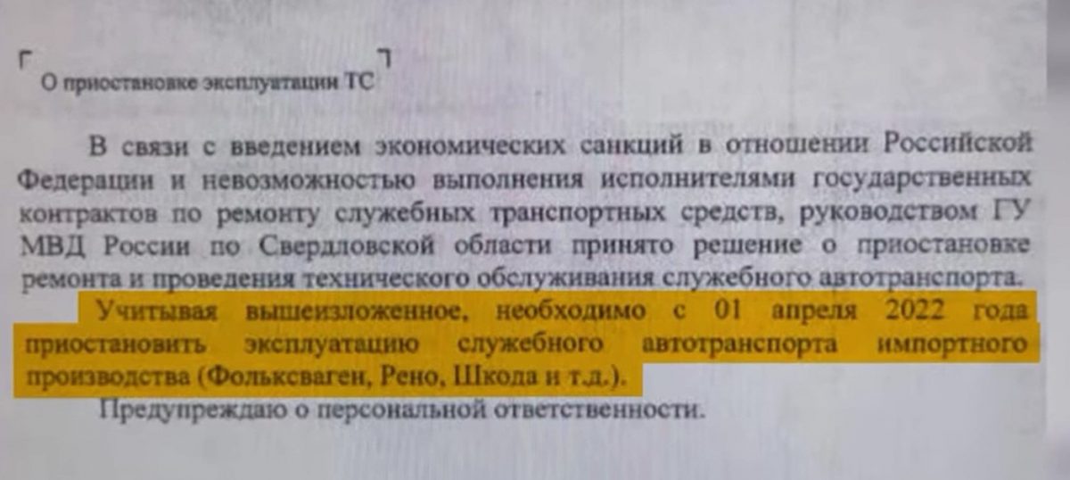 Наслідки санкцій проти рф не змусили на себе очікувати — так, у єкатеринбурзі працівникам мокшанської поліції вже заборонили використовувати у службовій діяльності іномарки — їх технічне обслуговування неможливо здійснювати за державними контрактами у зв’язку із введенням санкцій проти «запорєбрік».