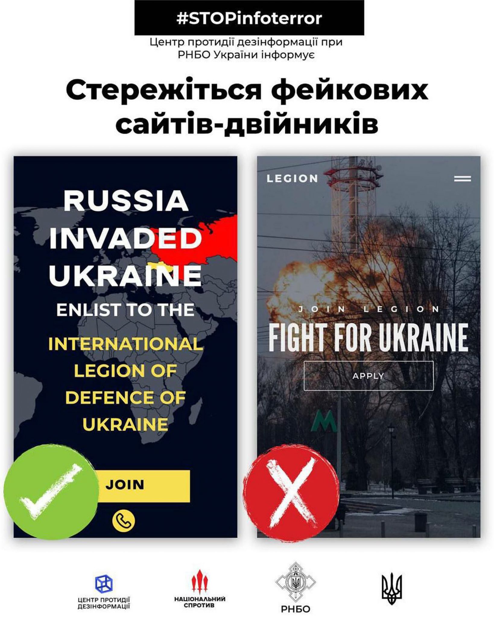Так, днями в соціальній мережі з’явився фейковий «двійник» сайту нашого Інтернаціонального легіону. Центр протидії дезінформації при РНБО України одразу ж виявив дешеву російську підробку.