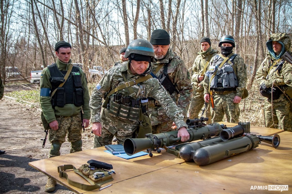 А неподалік новобранців навчають поводження з гранатометами. Хлопцям демонструють два зразки зброї, яка успішно використовується проти броньованої техніки — радянський РПГ-7 та новітній шведський ручний протитанковий гранатомет Carl Gustaf.