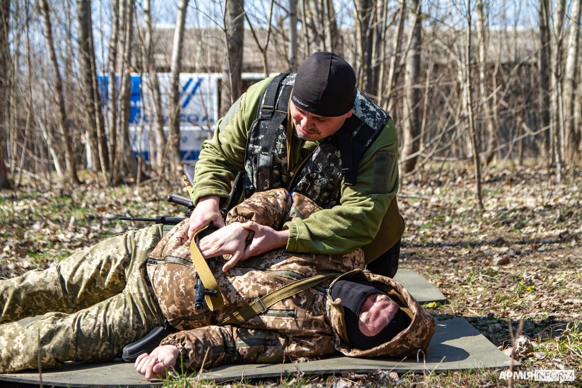 Навчальна точка з тактичної медицини. Інструктор Дмитро — за освітою фельдшер-акушер і ветеринар. До кінця лютого він працював анестезіологом у ветеринарній клініці. Розповідає, що вже тоді відчував: потрібно набути знань з тактичної медицини. Тому за можливістю спілкувався з бойовими медиками та тими, хто зазнав поранень під час бойових дій. «Закріпив» знання, надаючи допомогу постраждалим під час ворожих обстрілів рідного селища, що в Харківському районі.
