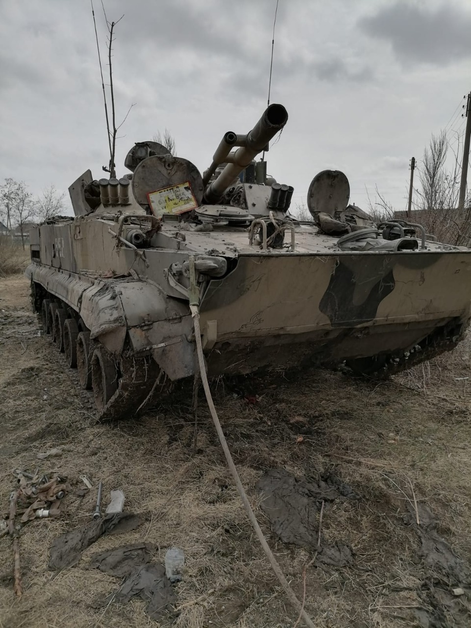 Із річки російську БМП-3 витягли за допомогою двох американських тракторів «Джон Дір» – бійцям ТрО радо допомогли місцеві фермери. Броньована машина – «шедевр» російської «оборонки» – декілька діб пускала бульки у воді, проте, за словами спеціалістів ремонтного підрозділу, двигун з ладу не вийшов. Зараз «броню» відправлено на ремонт. Найближчим часом вона працюватиме вже на ЗСУ.