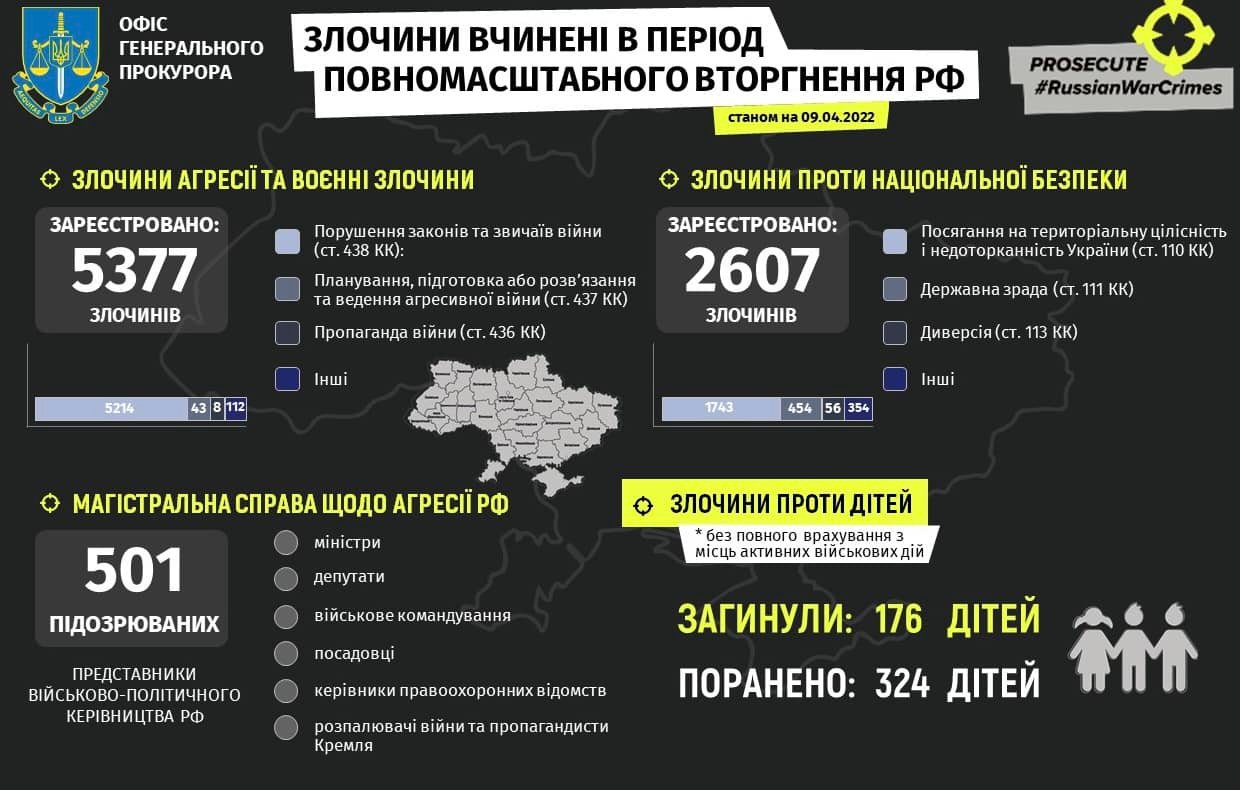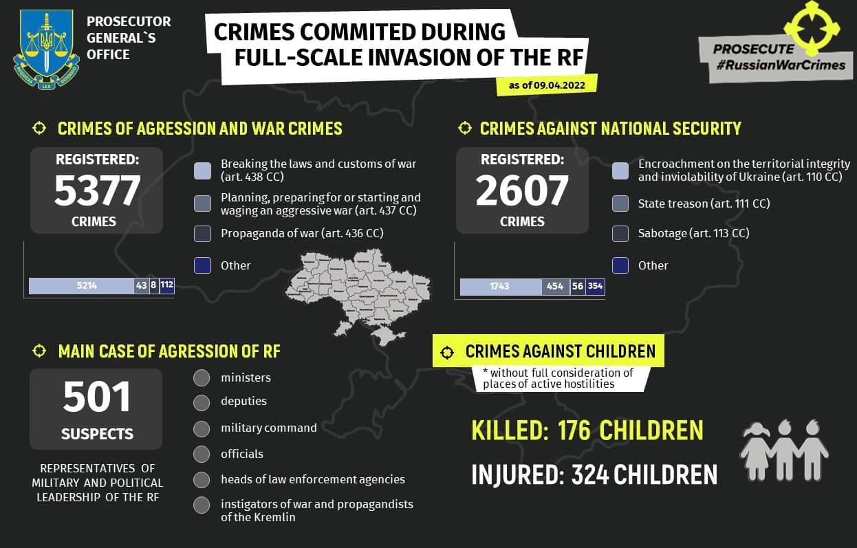 «Станом на 9 квітня зареєстровано 2607 злочинів проти національної безпеки, задокументовано 5149 воєнних злочинів окупантів, вбито 176 дітей», — йдеться у повідомленні.