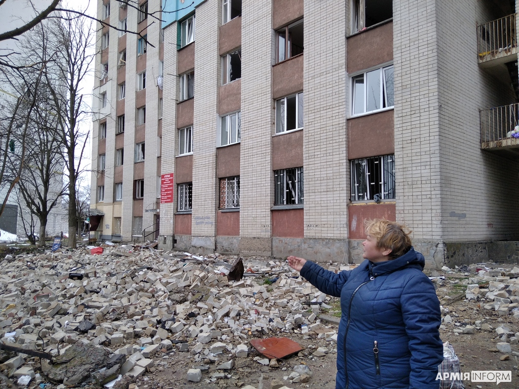 Поруч із будинком стоїть Зіна, яка теж мешкала в гуртожитку. Вона прийшла разом із сином і знайомими, які намагаються спустити її речі з восьмого поверху. Весь час, поки російські окупанти бомбили і обстрілювали місто, ховалися в гаражі.
