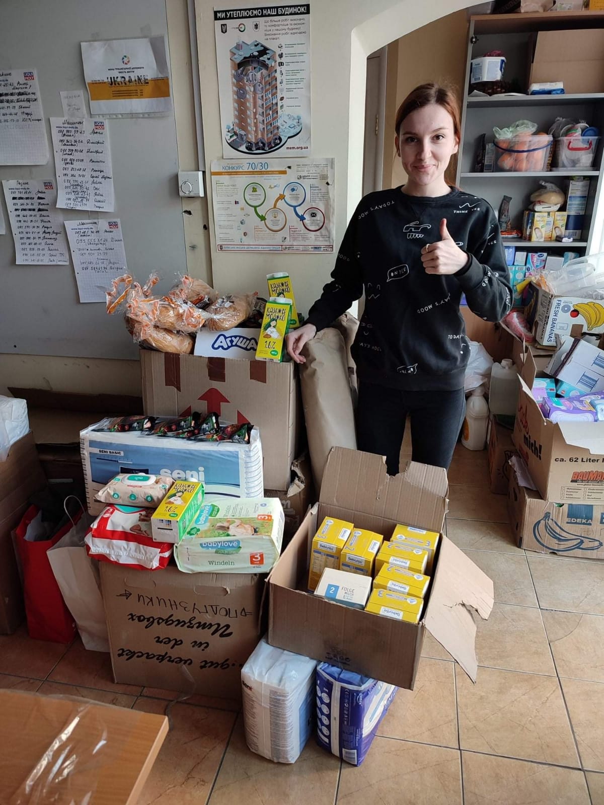 Задля забезпечення цих установ, а також бійців ТрО та переселенців Вадим Щербань, один із ініціаторів гуманітарного центру, налагодив доставку товарів першої необхідності зі Львова.