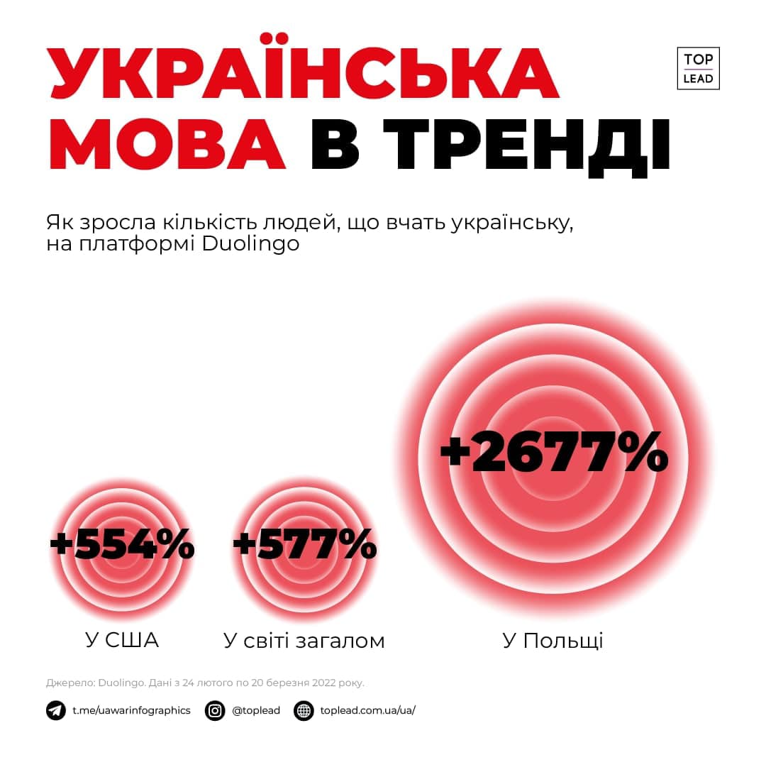 Сьогодні абсолютна більшість громадян України (83%) за те, щоб українська була єдиною державною мовою в нашій країні. Така думка, згідно з результатами опитувань, проведених наприкінці березня, домінує в усіх регіонах, вікових та мовних групах. Водночас за кордоном після початку повномасштабної російської агресії намітилася стійка тенденція щодо збільшення кількості охочих вивчати українську мову. Так, кількість людей, які вчать українську на платформі Duolingo у світі з 24 лютого до 20 березня зросла майже вшестеро. Лідером приросту є сусідня Польща, де цей показник зріс на 2677% (у 26,77 раза)! Хочеться сподіватися, що такий інтерес до української мови у світі збережеться надалі й незабаром наша мова в природний спосіб замінить російську в переліку офіційних мов ООН.