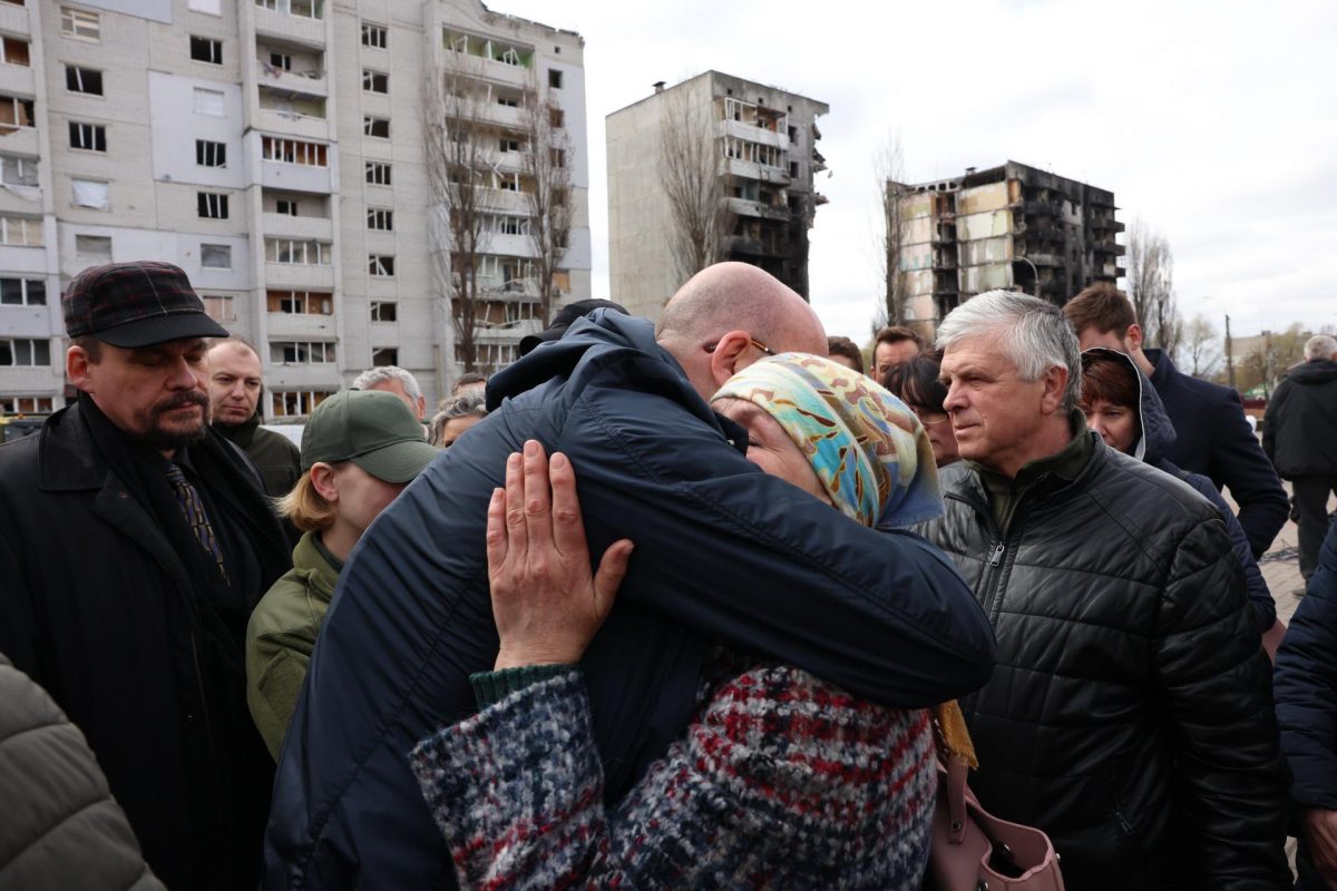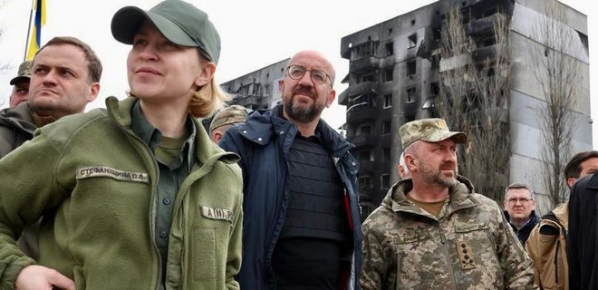 Під час візиту до України президент Європейської Ради Шарль Мішель відвідав зруйновану російськими окупантами Бородянку.
