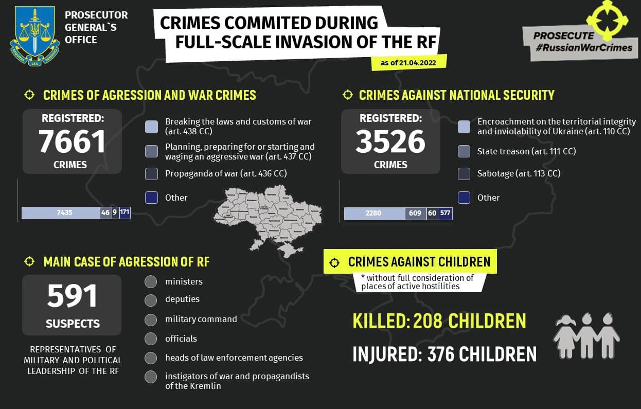 Офіс Генерального прокурора станом на 21 квітня задокументував 7661 злочин окупантів, вчинений у період повномасштабного вторгнення рф. Ворог здійснив 3526 злочинів проти національної безпеки і вбив 208 дітей.