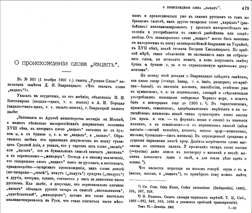 Загальнопоширене досі тлумачення, яке запропонував у тому ж ХІХ столітті перший ректор Київського університету Михайло Максимович, як жартівливе позначення людей, що носять довгі бороди, як цап = кацап, виявляється, було спростоване ще сучасниками науковця.