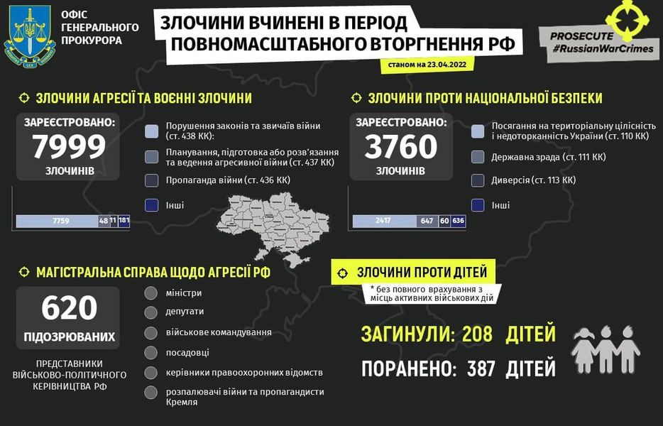 «Станом на 23 квітня задокументовано 7 999 воєнних злочинів та 3 760 злочини проти національної безпеки України. Внаслідок збройної агресії за офіційними даними ювенальних прокурорів 594 дитини постраждали в Україні внаслідок збройного вторгнення рф в нашу державу. При цьому 208 дітей загинуло та 386 отримали поранення», — повідомляють в Офісі Генерального прокурора.