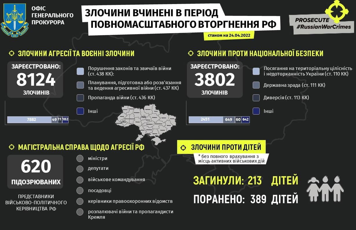 «Станом на 24 квітня задокументовано 8124 воєнних злочини окупантів. 213 дітей загинули внаслідок збройної агресії рф в Україні. Ці цифри не остаточні, оскільки триває робота з їх встановлення в місцях ведення активних бойових дій, на тимчасово окупованих та звільнених територіях», — йдеться у повідомленні.